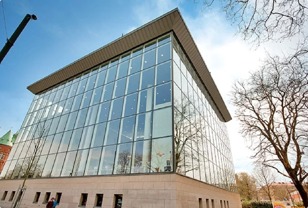 Vårt arbete bestod i att konstruera och installera den imponerande 18 meter höga glasfasaden som definierar ”Ljusets kalender”. Med sin transparenta design släpper fasaden in stora mängder naturligt ljus, skapar kontakt med parken utanför och ger biblioteket en öppenhet som symboliserar kunskapens tillgänglighet.
