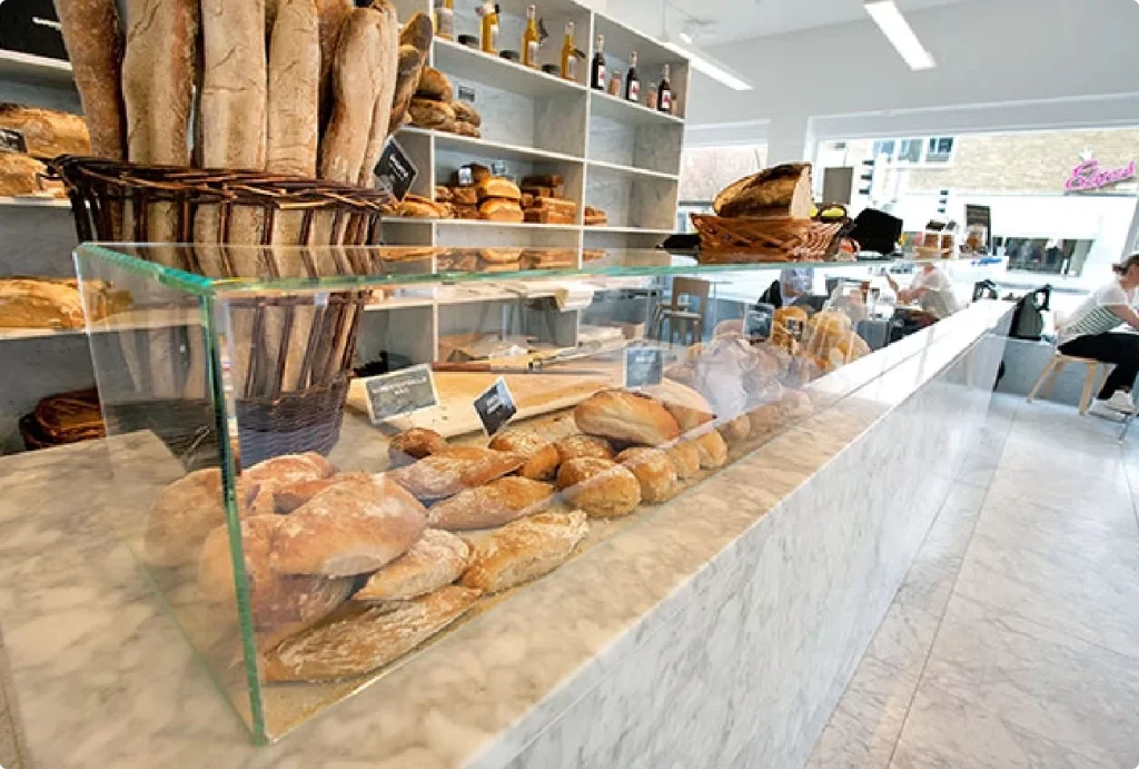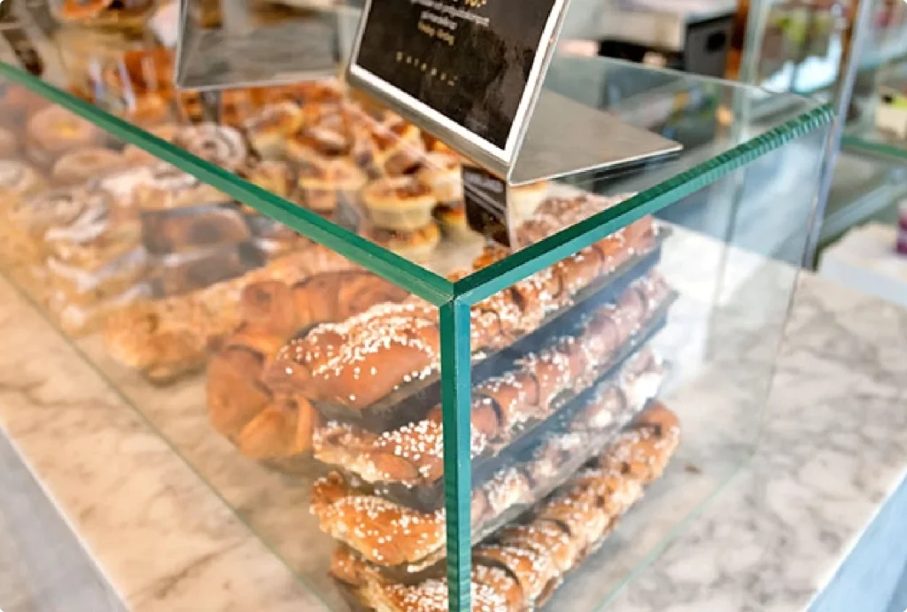 På ett café är glasmontrar ett måste – de skyddar bakverken och gör dem samtidigt mer lockande för kunden. Hos Gateaux installerade vi måttanpassade montrar vid betaldisken för att framhäva bröd, smörgåsar och bakverk på ett inbjudande sätt.